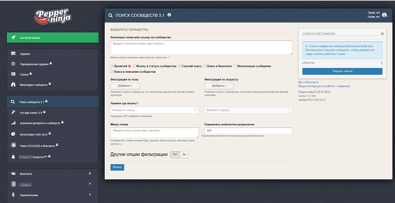 «Пеппер Ниндзя» — это онлайн-парсер для сбора аудитории в соцсетях, в котором более 140 инструментов и фильтров. Алгоритмы способны собирать данные пользователей по разным признакам: демографические параметры, возраст, пол, к какой области проявлял больший интерес.
