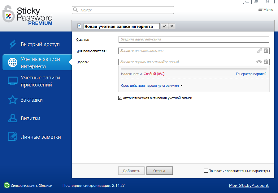 Программа допускает два варианта хранения логина и пароля: на ПК и в облачных хранилищах.. По умолчанию коды хранятся локально. Здесь встроен генератор паролей с возможностью настройки их формирования. Для правильного выбора менеджера паролей нужно понять, что важнее — максимальная защищенность или удобство использования. В первом случае предпочтение стоит отдавать софтам, у которых в приоритете локальное хранение данных, а во втором — программам с максимально удобной и продуманной синхронизацией.